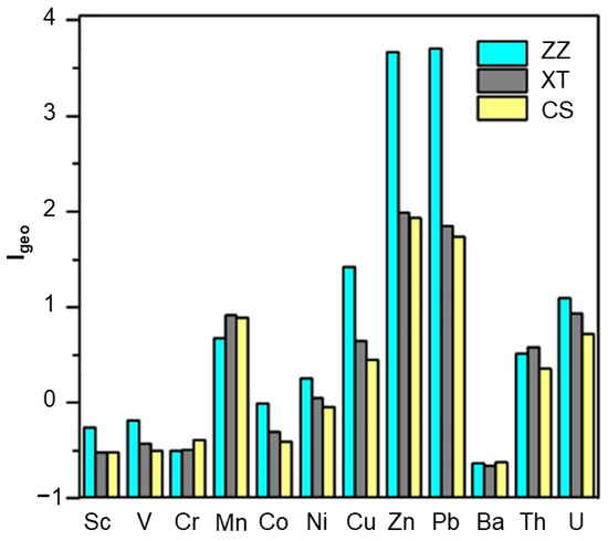 Specifically (Table 3), in the sediment of the ZZ section, the Zn and Pb in the ZX column reached heavy pollution, with the Igeo values at 4.735 and 4.230, respectively, while Cu was moderate pollution (Igeo = 2.085). For the ZU column, Pb (Igeo = 3.317) also reached heavy pollution, with moderate pollution from Zn (Igeo = 2.576). Furthermore, the Zn and Pb in the ZF column were also moderately polluted, and the U in the ZX and ZF columns were slightly moderately polluted. The XT section was similar to the ZZ section; Zn and Pb had moderate or slightly moderate pollution, and the average values of Igeo for U in all other sediment columns were less than 1, except for the slightly moderate pollution of the X1Q column. The heavy metal Mn was moderately contaminated in the sedimentary columns X2Q, ZB, and XT, and the average value of the remaining sedimentary columns Igeo was less than 1. In the CS section, the Zn and Pb of the sedimentary column JZ were moderately polluted, with the Igeo values at 2.295 and 2.135, respectively. The Zn in the SG column was also moderately polluted, while the Zn and Pb in the remaining sedimentary columns were slightly moderately polluted. The Mn for all of the columns in the CS section was slightly moderate pollution, except for the XW column, i.e., the average value of Igeo was >1. Other heavy metals (except for Th and U) in the sediment of the CS section were in a clean state.