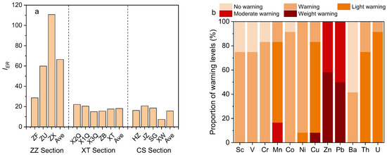 Ecological risk early warning of heavy metal pollution in the studied sections was analyzed using the ecological risk early warning index (IER) method [31]. Results of IER (Figure 6a) showed that CS-ZZ-XT sections were all severe warning with IER > 7, and the XW point in the CS had the lowest IER value (7.3). Additionally, the average IER value of each river section suggested the following warning levels of heavy metals in sediment: ZZ section > XT section > CS section, with the average IER at 66.4, 18.1, and 15.7, respectively. In the ZZ section, the IER showed an increasing trend from upstream to downstream, with the highest IER value at the ZX point (110.7) and the lowest IER value at the ZF point, which was also as high as 28.6. In the XT section, the IER values at different points were relatively close, located in the range of 15.0–22.1. In the CS section, in addition to the XW point with the lowest IER value (7.3), the IER of other points was also relatively close, between 16.1 and 20.7. The above results showed that the pollution degree of heavy metals in the sediments of the ZZ section was the highest and most uneven, while that of the XT and CS sections was relatively low.