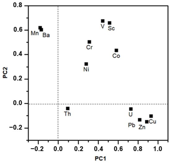 Elements of the same origin and properties in sediments showed similar distribution characteristics. The principal component analysis of sediment trace elements was combined with enrichment characteristics to identify the natural and anthropogenic sources. The results revealed that the principal components PC1 and PC2 could extract 33.768% and 22.516% of all information, respectively. The total contribution rate was 56.28%, which could effectively explain 12 variables (7.767 + 5.179 eigenvalues). A projection map of the principal components of heavy metal elements is shown in Figure 7. It can be seen that all elements were obviously concentrated in three load regions: Zone I with negative load (PC2 < 0) on PC2 included Th, U, Pb, Zn, and Cu. Combined with the statistical results of the enrichment coefficient, it was found that the average EF of these elements was greater than 1 (Figure 4), especially Cu and Zn (EF > 20 in some sediment samples). It was suggested that these heavy metals were enriched in the sediment, obviously, according to the EF value of the source characteristics of trace elements [45,46]. In addition to their natural sources, these elements also had contributions from anthropogenic sources [15].