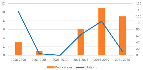 Several articles have been published over the last 22 years. Figure 2 shows the number of articles published per year, which reflects an increasing trend over the years, noting that between 2002 and 2011, these themes were less relevant. Although there was a first publication in 1996, in the following two decades, there was a reduced number of publications, with an average of only 0.88 per year, which varied between 0 and 4. With eight publications, 2021 was the year with the most production on this topic. Figure 2 also shows that 1998 has the most citations, with the publication of only two articles.
