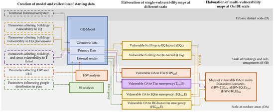 The applied method considers the opportunity to establish a multi-layered system of information in a geographic information system (GIS) environment. This system allows for the study of places exposed to single-hazard and multi-hazard—but asynchronous—scenarios (here called MAH). The GIS model is designed to collect, reorganize, and correlate all the data involved in the vulnerability assessment for both single-hazard cases and in MAH scenarios, according to the proper scale. In fact, the approach involves the entire historic district extension (D), from the municipal-territorial to the detailed scale of the district and its essential units as Outdoor Areas (OAs—streets, squares) or buildings (B) and their components (SB—walls, roofs, etc.). All the required data are gathered starting from the parametrization process outlined in Section 1, and combining detailed information (wall materials, roof technologies, etc.) with complex data obtained from external analyses. Finally, the model became functional in translating vulnerability and critical levels of fabrics into properties of Outdoor Areas, thereby preparing for the assessment of public open spaces in MAH scenarios. In the Apulian cases, the process combines the analysis of the microclimate impact of climate change events and the inherent morpho-constitutive characters of the C-BE, the identification of areas of the C-BE that are vulnerable to natural and anthropic RODs and the assessment of heritage assets within the hazard zones potentially affected [60]. These zones are then related to the potential capacity to solve the emergency process, assessing the spatial vulnerability of the places where this spatial vulnerability results from the analysis of relations between their geometric and morphological features and the perception of asset by users, which can affect the emergency phase of sudden onset events.