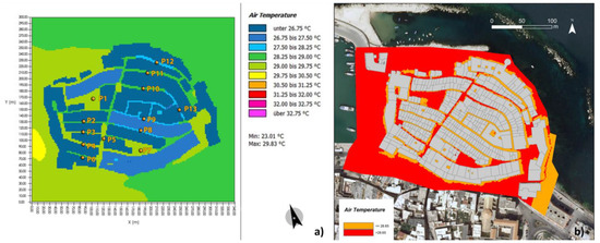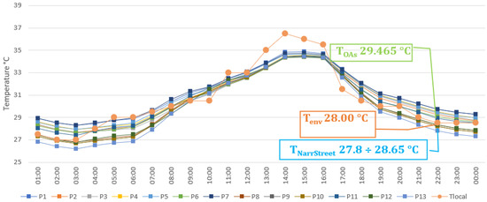 Subsequently, the fluid dynamics results for the assessment of the effect of the urban heat island in the district were analyzed, starting from data acquired in the local micro-climatic survey in 2017 by the authors [42]. Specifically, the results highlight the resistive–adaptive behaviour of compact C-BE during the summer middays (Figure 2—from 13:00 to 16:00), reflecting significant differences between environmental temperatures (Tenv) and simulated ones in all the 13 reference checkpoints (Figure 3a). On the other hand, the urban heat island effect is maximized during the nighttime hours, particularly in public open areas (OAs) (Figure 2—from 20:00 to 04:00, and Figure 3a), due to the combination of the direct solar exposure during the day, the reduced ventilation, and the high thermal capacity of the flooring material (calcareous).
