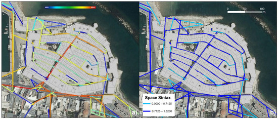 Traditional emergency spatial analyses focus mainly on quantifiable environmental and physical elements, which can be approximated. In contrast, detailed information about the population and users, let alone their dynamic behaviour, is considered neither relevant nor measurable. Consequently, for the present study, it was assumed that the vulnerability parameters [R.H. 1, 2, and 3] are partially met and, therefore, do not constitute significant vulnerability aggravation to be considered in the conducted analysis. In fact, there is a municipal emergency plan [53] for disaster management, which includes indications of safe waiting and reception areas. Additionally, some communication campaigns were activated for its dissemination and a real-time alerting service via smartphones are active and available (https://molfetta.infoalert365.it/infoalert365/, accessed on 3 August 2023). Moreover, data on the resident and transient population are collected annually, albeit spatially aggregated and not distributed by type or temporally differentiated within the year. Information on the use of open and enclosed spaces is fully available but only accessible to decision-makers and experts. On the other hand, parameters from [R.H. 6 to 8] are not assessable at all since no open data are available, and this would require ad hoc survey campaigns. Finally, the space syntax analysis developed aims at partially account for [R.H. 4], [R.H. 5], and [R.H. 9] factors, as outlined in Table 2 and described in the next paragraph.
