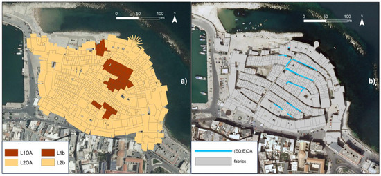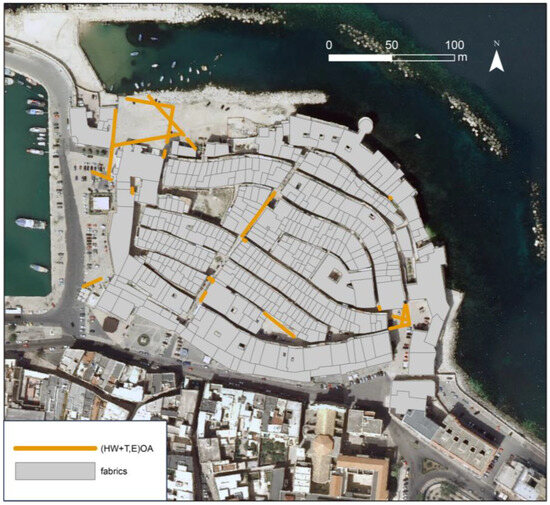 - Building vulnerability to seismic and/or hydrogeological [EQ and HG] events according to [29,33] methods, respectively. In these cases, the relation between building performances and OA is reached reflecting the proper level of building vulnerability outside them. Specifically, the related OA vulnerability maps result from the projection, along streets or places, of facades or buildings, respectively, for seismic and hydrogeological risk [vulnerability maps of EQB; HGB].