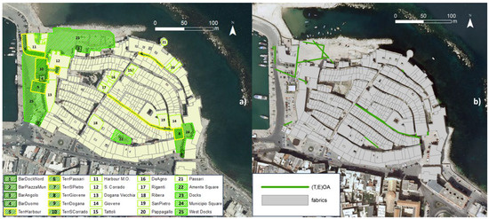 Buildings and places with historical significance represent a part of the urban heritage characterized by a lower resilience value due to the combination of the high intrinsic vulnerability levels and cultural/historical value. However, such a built environment constitutes an exception to mainstream emergency management and urban transformation processes [9,10] due to the administrative–conservative laws that define its protection. This restrictiveness is also linked to the slow process of their creation and modification over time, which generated a multiplicity of morpho-organizational features on the district level and morpho-constitutive attributes (and thus performances) characterizing the building scale. Therefore, their transformation, especially those aimed at disaster management, should account for the preservation of all the values related to the traditional experience of places. This is also in line with recent activities for the conservation of the so-called historic urban landscape, as discussed in the recommendation by UNESCO [11] where member states recognize the strong connection between the sustainable growth of cities and the protection of cultural heritage. In a multi-hazard perspective, this becomes a central point for discussing single or multiple technical solutions that are both compatible with places and effective for the emergency phase [12]. Moreover, historic centres constitute “cultural” parts of the built environment in cities and such relevance welcomes the presence and the interaction of inhomogeneous classes of users, both residential and tourists [13]. Simultaneously, the concepts of “disaster management”, “management of transformations”, and “choice of solutions” extend their dimension towards a district level, conceiving the multiple uses and users of external areas as well as information management on a larger scale. In this context, the assessment of vulnerabilities at a district scale for ancient urban cores is part of the historic urban landscape approach as an opportunity to study their inherent positive features to be preserved near to tangible and intangible values [14,15,16].