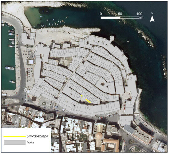 As discussed in Esposito et al. [60] and in line with the need to provide a general methodology applicable to similar C-BEs with similar peculiarities, the historic centre of the municipalities of Molfetta (BA) was identified as a suitable case for the proposed research. In this work, MAH scenarios were tested on the historic centre of Molfetta due to the morpho-typological and morpho-distributive features of its buildings, as well as their arrangement, emblematic of the nearest coastal regional cities. As emerged from the preliminary analysis and according to the main aim of the work, all the parameters involved in the physical vulnerability are collected, following the summarized data previously listed in Table 1 and thus collected and analyzed for the case study (Table 2).