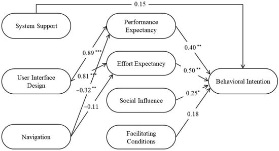 As shown in Figure 3, among the extended UTAUT model, PE (β = 0.40, p < 0.001, |t| > 1.96), EE (β = 0.50, p < 0.001, |t| > 1.96), and SI (β = 0.25, p < 0.05, |t| > 1.96) were definitely associated with BI, while FC (β = 0.18, p > 0.05, |t| < 1.96) was not associated with it (H1, H2, and H3 were supported; H4 was not supported). In terms of UI characteristics, UID was positively associated with PE (β = 0.89, p < 0.001, |t| > 1.96) and EE (β = 0.81, p < 0.001, |t| > 1.96) (H6 and H7 were succeeded). NAV (β = −0.32, p < 0.01, |t| > 1.96; β = −0.11, p > 0.05, |t| < 1.96) was negatively correlated with PE and was not associated with EE (H8 was supported; H9 was not supported). Path analysis results shown that SS (β = 0.15, p > 0.05, |t| < 1.96) was not correlated with BI (H5 was not supported).