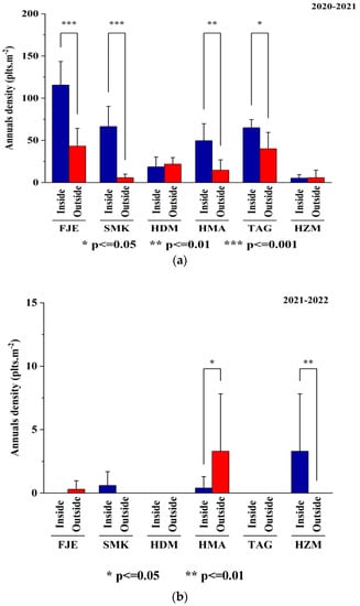 Similarly, a significant difference (p ≤ 0.05; p ≤ 0.01) was observed for the HMA and HZM sites in 2022. In the third year, the densities increased compared to 2022 across all sites, but there was no significant difference between the inside and the outside, except for the HMA site. The HMA site exhibited, however, a higher annual density inside the protected area compared to the overexploited outside area.