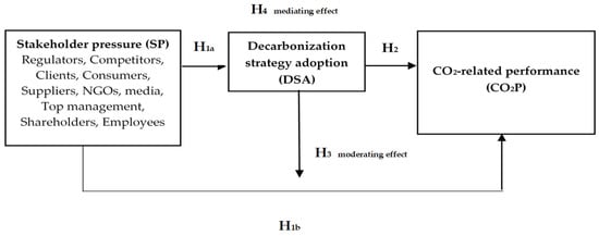 However, the relationship between stakeholder pressure and carbon reduction performance is not solely direct. Corporate decarbonization strategies may play a pivotal mediating role in this relation. Buysse and Verbeke (2003) and Cadez et al. (2019) highlight that environmental strategy (integrated within the broader business strategy) embodies a managerial interpretation of stakeholder requirements [15,51]. Firms facing significant stakeholder pressures are more likely to implement advanced decarbonization strategies, which encompass various operational, technological, and managerial initiatives. These strategies act as a bridge between stakeholder pressures and actual CO2-related outcomes. Furthermore, the extent to which stakeholder pressures directly translate into carbon reduction performance is also influenced by the nature and effectiveness of a company’s decarbonization strategies [25,55]. On the one hand, firms adopting active strategies are under stronger pressure from stakeholders, which may result in their better carbon reduction achievements [29,56,57]. On the other hand, companies with less effective strategies might not fully capitalize on stakeholder pressures to drive significant CO2-related improvements [56,57]. Therefore, it is argued that the decarbonization strategy may play a role as a mediator and moderator. Based on the above arguments, the following hypotheses are proposed: