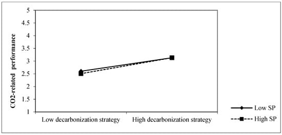 A moderation analysis was conducted to examine the influence of the predictor variable, stakeholder pressure, on the outcome variable, CO2-related performance, while considering the moderating effect of the categorical variable-decarbonization strategy (model 4). The results indicate that the overall model is statistically significant and accounts for 21.6% of the variance in CO2-related performance. The predictor variable, stakeholder pressure, shows a non-significant direct effect on CO2-related performance (b = 0.264, t = 1.591, p = 0.113; LLCI = −0.0635, ULCI = 0.5919), indicating that stakeholder pressure alone does not have a significant impact on CO2-related performance. Furthermore, the interaction effect between stakeholder pressure and decarbonization strategies (SP × DSA) was also included in the model. The analysis reveals that this interaction is not statistically significant (b = 0.0487, p = 0.5956; LLCI = −0.1321, ULCI = 0.2296), suggesting that the moderator variable, decarbonization strategy, does not significantly moderate the relationship between stakeholder pressure and CO2-related performance. In summary, the results of this moderation analysis indicate that decarbonization strategies do not have a significant moderating effect on the relationship between stakeholder pressure and CO2-related performance. The model accounted for a significant portion of the variance in CO2-related performance, but the direct effect of stakeholder pressure was not significant, not supporting hypothesis H3. These findings contribute to our understanding of the factors influencing CO2-related performance in the context of the studied variables. A graphical presentation of the moderation analysis is presented in Figure 2. The results of the regression analysis are presented in Table 4.