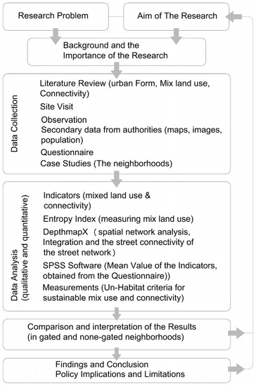 The research adopted the mixed-method approach of qualitative and quantitative methods (Figure 1). The qualitative approach was used to explore, describe, and interpret the results via a combination of literature review, site visits, and observations. Nevertheless, different tools were used during the analysis of quantitative data, such as IBM_SPSS_Statistics_25.0x64, to assess residents’ satisfaction in each neighborhood. In addition, depthmapX-0.8.0 software was used for space syntax and street network analysis, as well as MS Excel 2019. Moreover, the entropy index equation was used for measuring the mixed land use of different neighborhoods. Lastly, the results were compared with each other and with the UN-Habitat criteria of sustainable neighborhoods. Using different tools was crucial to examine the mixed land use and connectivity of the selected neighborhoods, as space syntax analytical techniques only investigate layouts seen in plans. Therefore, the designed method helps us to gain deeper insight into the elements that need improvement in each neighborhood and the level of intervention required to achieve the sustainability goals.