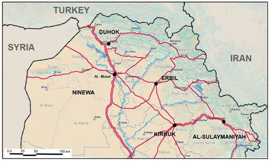 The central location of Erbil according to the northern part of Iraq. (Source: [49], modified by the author).