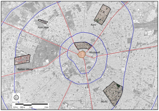 The locations of the neighborhoods according to the city center, the red lines demonstrate the radial streets, while the blue lines are the circular streets. (Source: satellite image 2019, from Erbil municipality, modified by the author).