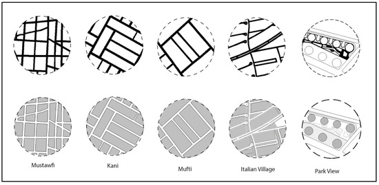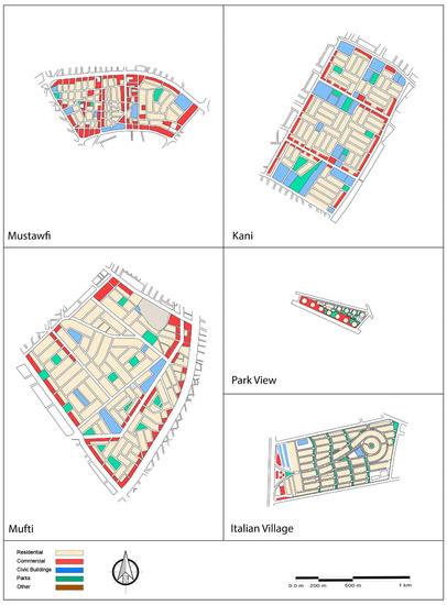 The land-use plan and the street network of the case studies. (Source of the map: Erbil Municipality, drawing by the author).