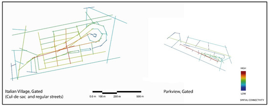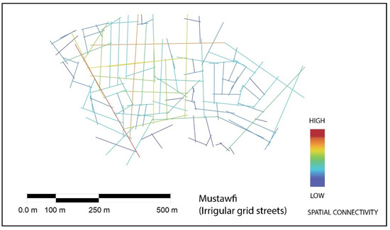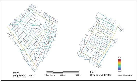 The street connectivity of the selected neighborhoods was computed by utilizing the space syntax technique with depthmapX-0.8.0 software. The attribute summary (Table 6) provides the average value for the following measures: a—connectivity (A street with many connections to its side streets has a high connectivity value, whereas a street with few connections has a low connectivity value [59]). b—integration (a normalized measure of the distance from a given space to all others in a system, which is used to calculate how close the original space is to all other spaces and can be seen as a measure of relative asymmetry). c—choice (measures how likely one is to pass through a street segment on all the shortest routes from one space to all other spaces in the entire system or within a predetermined distance from each segment [60]). d—node count (measures the number of lines encountered on the route from the selected line to all others). A spectral color legend is used to show the streets’ connectedness, with red indicating the highest values and blue indicating the lowest (Figure 6, Figure 7 and Figure 8). The blue axial lines along the boundary walls on the maps indicate lower connectivity with the surrounding neighborhoods.