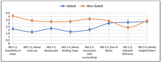 In this study, the results of the residents’ responses to connectivity in the Italian Village, despite it being a gated neighborhood, are positive. This can be attributed to the wide streets and the good condition of the walkways, which ensure walkability (Figure 10). For Park View, the mixed use and connectivity mean values are below the total average of the means for all the neighborhoods. Thus, it is necessary to create more stores and different economic activities in the gated neighborhoods. Since high-rise buildings can accommodate a higher number of housing units across multiple floors, a mixture of high-rise and low-rise residential buildings could be an effective strategy to overcome this issue, especially in gated neighborhoods. Accordingly, authorities can take advantage of the additional available area to increase greening, which will also help to ensure the walkability of the neighborhood. Furthermore, a comparison between the mean values of the gated and non-gated neighborhood indicators showed a higher degree of satisfaction in non-gated neighborhoods (Figure 11).