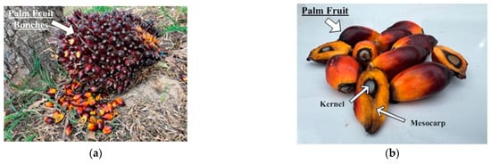 Palm oil is produced when fruits are removed from oil palm bunches for oil extraction, leaving only the fruit’s stem and spikelet. Palm oil is a vegetable oil that uses raw materials, namely the fruit of the palm tree, a yellow-orange oil scientifically known as Elaeis guineensis, which contains 45–55% oil [1,17]. Palm oil is obtained from two parts of the palm fruit: the mesocarp, the oil called palm oil, and the kernel, called palm kernel oil, as shown in Figure 1. Empty fruit bunches may contain as much as 60% moisture due to the combining of steam from the sterilising process of oil extraction and continuing biological development [18]. Palm oil obtained from the production process has a very high moisture content. Therefore, before using palm oil for use or testing as a liquid insulator in electrical equipment, the moisture content in palm oil must be reduced first.