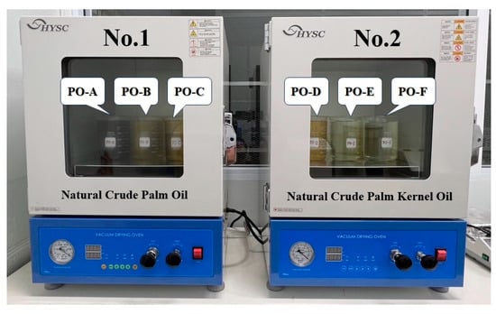 Six palm oil products were investigated in this study, as shown in Table 1. All samples are obtained from readily available products in the palm oil industry of Thailand. Moreover, all types of natural palm oil were tested in comparison with conventional transformer oil. Naphthenic mineral oil from the APAR Company in India (POWEROIL TO 20 X) was used for the experimentation [19]. Preparation of palm oil samples began with adding palm oil samples to prepared beakers and vacuum drying with an oven heated to 60 °C for 24 h at a pressure of −0.08 MPa (model: Han Yang Scientific, Republic of Korea). This process was performed to lower the content of dissolved water in the samples, thereby enhancing the level of uniformity, as shown in Figure 2 [20].