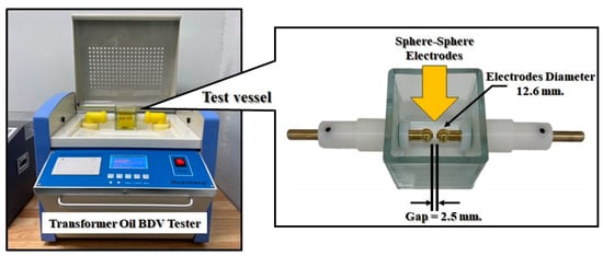 AC breakdown voltage tests were performed on natural palm oil and conventional mineral oil. This was carried out through Huazheng Electric, a model HZJQ-1 transformer oil dielectric strength tester and oil breakdown voltage testing tool with a rated 100 kV oil breakdown voltage analyser. The volume capacity of the test cell was 250 mL, and it was made up of sphere–sphere electrodes with a gap spacing of 2.5 mm and a diameter of 12.6 mm. As can be seen in Figure 3, the breakdown voltage test was carried out in accordance with the standards set out in IEC 60156 [21].