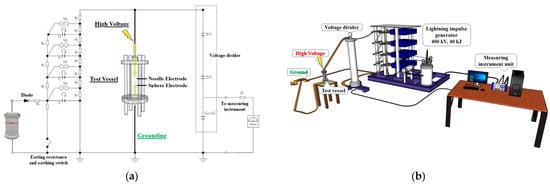 Test circuits for measuring lightning impulse breakdown voltage strengths: (a) equivalent circuit for measuring lightning impulse breakdown strengths; (b) test circuit preparation.