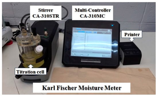 Six palm oils and conventional mineral oils were both analysed for moisture content using the MITSUBISHI CA-310 moisture analyser model, as shown in Figure 6. According to ASTM D1533 [25], the oil’s moisture content was measured using the Karl Fischer titration method. One millimetre of oil was taken out and put into titration vessels with CombiCoulomat fritless Karl Fischer reagent for each of the moisture measurements [26]. This paper was measured three times in total, and the analysis used the average value.