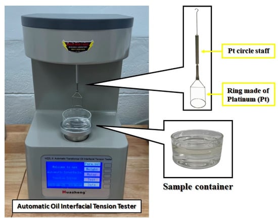 Liquid insulation surface tension is a result of the presence of intermolecular forces. The quantification of tensions shown by the liquid sample in relation to its physical and chemical characteristics is a crucial determinant of the quality of oil. This approach is commonly used due to its ability to sample and provide accurate results. In this study, an analysis was conducted to determine the interfacial tension of natural palm oil and conventional mineral oil. The Huazheng model HZZL-3 automated tension tester, as seen in Figure 7, was used for this purpose. The ASTM D971-20 [27] standard provides a comprehensive framework for evaluating various types of liquid surface tension and boundary surface tension.