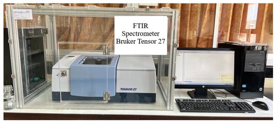 Oil samples were analysed and characterised for their physical and chemical constituents using FTIR spectroscopy. Technology advancements have allowed for the characterisation of the physical and chemical properties of oils as dielectric insulating fluids in transformers [32,33]. To determine what molecules are present in a sample, FTIR spectroscopy uses the absorption or transmission of infrared light, which is used to differentiate between different molecules [34,35]. All of the oil samples in this paper (six types of natural palm oils and one conventional transformer oil) were analysed by FTIR using a Bruker Tensor 27 FTIR Spectrometer (Billerica, MA, USA) under the wave number range of 700 to 4000 cm−1, as shown in Figure 10.