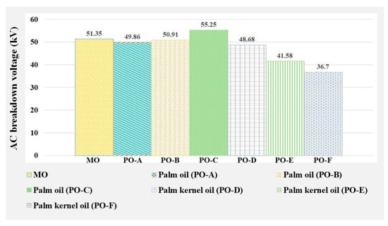 The dielectric strength measures the electric field strength at which the insulation fails. The insulating material, contaminants, and electrode geometries all have a role, as does the electric field [36]. Mean breakdown values are often used to assess the quality of an insulating liquid. In this study, the breakdown voltages are fitted using the distributions. Figure 11 provides a comprehensive illustration of the average value at which PO-C exhibits the maximum breakdown voltage for dielectric strength. PO-B has the second-best AC breakdown voltage, whereas MO, PO-A, PO-D, PO-E, and PO-F show a drop in breakdown voltage in oil samples, correspondingly. In the meantime, the AC breakdown voltage of MO is found to be lower than that of PO-C, and this discovery is consistent with prior studies [37,38] in this regard. It is possible that contamination, specifically the oil sample’s moisture [32] content or relative humidity, which both have an impact on the breakdown voltage, was the cause of this situation. It is possible for moisture to be acquired during the process of transferring the oil sample from the bottle to the test cell, which includes putting the oil sample in direct contact with the atmosphere. The oil samples have been proven to contain moisture because of the oil absorbing moisture from the atmosphere [37,39]. Moreover, the physicochemical features, impurities, and solid particles present in the liquid medium at the time of the test all contribute to the statistical quantity known as the breakdown strength of the medium [40,41]. In accordance with standard [42] of the IEC, this meets the prerequisite for the breakdown voltage of insulating fluids.