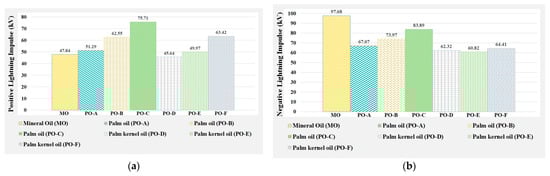 An investigation into the impulse breakdown strength is carried out in order to assess the impulse breakdown features of oil. When attempting to measure the quality of an insulating liquid, it is common practice to calculate the mean values of the breakdown [43]. On the other hand, transformers are constructed using the minimal amount of voltage that the insulation can sustain rather than the average level of voltage that it can resist. Figure 12 illustrates the average impulse breakdown voltages together with the lowest and maximum values for palm oil and traditional mineral oil respectively. Analysis of the data has shown that the impulse breakdown voltage in the results has shown that in palm oil samples PO-A, PO-B, PO-C, PO-E, and PO-F, the impulse breakdown voltage with positive polarity can be higher than in mineral oil, especially in palm oil PO-C, which has the highest breakdown strength, except for palm oil D, which is lower than mineral oil, as shown in Figure 12a. For the negative polarity of the impulse breakdown voltage, the results of the tests on all palm oil samples were still good when considering the tendency towards impulse-withstand values, especially palm oil PO-C, which has the highest value in the palm oil group. However, conventional mineral oil is stronger than all palm oil samples, as shown in Figure 12b. The polarity effect of the lightning impulse breakdown voltage is affected by the space charge as well as the distinct chemical structures of palm oil and mineral oil [44,45].