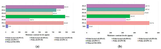 A comparison of the average value of the moisture content between six palm oils and conventional mineral oils includes (a) before drying under vacuum; and (b) after drying under vacuum.