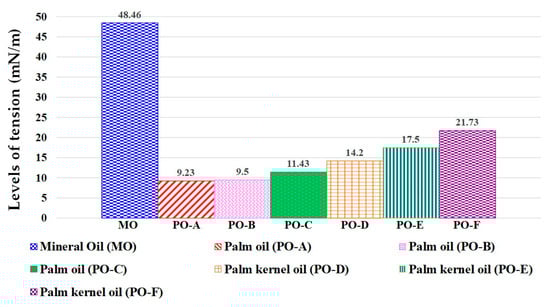 Comparison of the surface tension between six palm oils and conventional mineral oils.