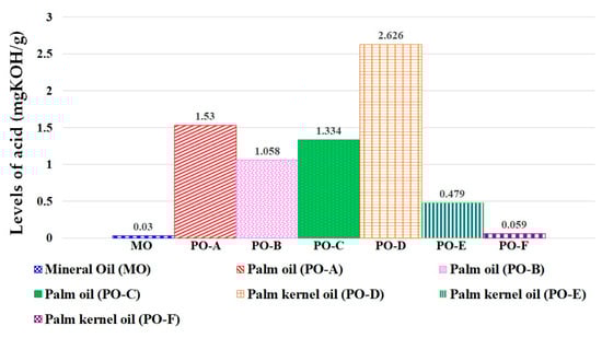 At the same drying vacuum temperature of 60 °C, the acidities of conventional mineral oil remain at low values of 0.03 mg KOH/g, including PO-F at values of 0.059 mg KOH/g. Figure 15 shows that the PO-A, PO-B, PO-C, PO-D, and PO-E samples have high acidity values of 1.53, 1.058, 1.334, 2.626, and 0.479 mg KOH/g, respectively. The acid values seen in oil are mostly attributed to the presence of fatty acids, which are often found in the form of triglycerides. However, during the processing of oil, hydrolysis reactions often occur, resulting in the conversion of triglycerides into free fatty acids. Hence, a clear correlation exists between the acid value and the concentration of free fatty acids. This implies that an elevated acid value will result in increased levels of free fatty acids, thereby leading to a decline in the overall quality of the oil. According to [52] AOCS (2003), the maximum acceptable amount for vegetable oil is 0.6 mg KOH/g.