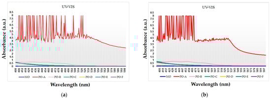 Variation in the UV-VIS absorbance with respect to wavelength between six palm oils and conventional mineral oils: (a) UV-VIS absorbance with liquid samples before drying under vacuum; and (b) UV-VIS absorbance with liquid samples after drying under vacuum.