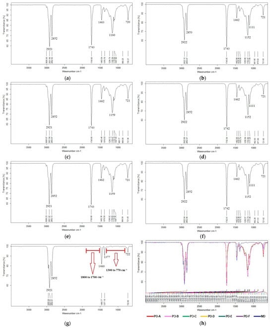 Variation in the FTIR spectra with respect to wavenumber of six palm oils and conventional mineral oils: (a) FTIR spectra of PO-A sample; (b) FTIR spectra of PO-B sample; (c) FTIR spectra of PO-C sample; (d) FTIR spectra of PO-D sample; (e) FTIR spectra of PO-E sample; (f) FTIR spectra of PO-F sample; (g) FTIR spectra of MO sample; and (h) FTIR spectra of all liquid samples.