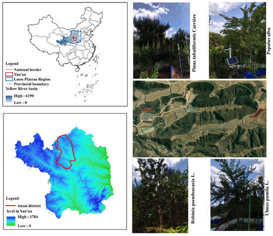 The study was conducted in the village of Nangou, Ansai District, Shaanxi Province, on the Loess Plateau of China (Figure 1). Ansai District belongs to Yan’an City, located in the hinterland of Loess Plateau, which is a hilly and gully area of Loess Plateau in northern Shaanxi (108°5′44″–109°26′18″ E, 36°30′45″–37°19′3″ N). The area is characterized by a complex landscape of gullies and ravines, with an altitude of 1068–1309 m and a total area of 2950 km2. It belongs to the mid-temperate continental semi-arid monsoon climate, with an annual average temperature of 8.8 °C and an annual average precipitation of 505.3 mm, which is mainly concentrated in June–September, accounting for 73.6% of the annual precipitation. Soil types in Yan’an include Cinnamon soils, Cultivated loessial soil, Red earths, Dark loessial soils, etc., among which, loessial soil is the most widely distributed. The terrestrial vegetation is warm temperate deciduous broad-leaved forest to dry grassland transition forest grassland area, the main establishment species are Quercus liaotungensis Koidz., Artemisia sacrorum Ledeb., Bothriochloa ischaemum L., Ostryopsis davidiana Decne., etc., to artificial vegetation types, such as R. pseudoacacia L., P. tabulaeformis Carr., P. alba L., Astragalus adsurgens Pall., Caragana korshinskii Kom., etc. With the introduction of “Grain for Green” project in the 1990s, most of the arable land in Yan’an has been converted into forest and grassland.