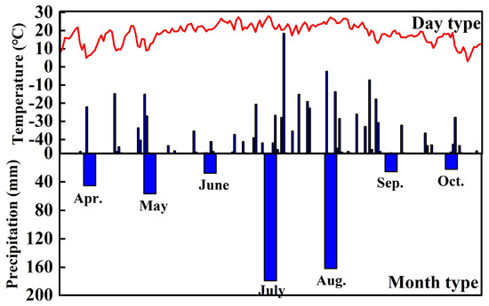 Temporal variations of air temperature and precipitation during the growing season. Note: the line shows the daily trend in temperature over the growing season, and the bars show the daily and monthly trends in precipitation over the growing season.