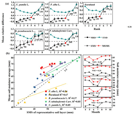 Depending on the desiccation classification criteria (Table 3), the degree of soil desiccation of artificial forests was heavy in June, light in April and July, and there was no desiccation in the remaining months. The soil desiccation index (SDI) decreased with the increasing soil depth, where the soil was moderately desiccated in the 0–40 cm layer, mildly desiccated in the 40–60 cm layer, and not desiccated in the deeper layers. The 0–40 cm soil layer of the P. alba L. was lightly desiccated, and the 0–20 cm soil layer of P. tabulaeformis Carr. was lightly desiccated. For farmland, the 0–20 cm and 40–60 cm soil layers of farmland were moderately desiccated, and the 20–40 cm and 60–80 cm soil layers were lightly desiccated. For R. pseudoacacia L., the 20–60 cm soil layer was heavily desiccated, the 0–20 cm and 160–180 cm soil layers were moderately desiccated, and the 60–160 cm soil layer was lightly desiccated. For U. pumila L., the 0–20 cm soil layer was strongly desiccated and the 20–40 cm soil layer was heavily desiccated (Figure 4). Temporal stability analyses showed that the 90 cm soil layer in the 200 cm soil profile in P. tabulaeformis Carr., U. pumila L., R. pseudoacacia L., and farmland had a mean relative difference (MRD) value closest to 0 and the smallest index of temporal stability at depth (ITSD) value, so the representative soil layer for SMS in farmland, P. tabulaeformis Carr., U. pumila L., and R. pseudoacacia L. was the 90 cm soil layer. Correspondingly, the SMS representative soil layer for P. alba L. is the 70 cm layer (Figure 5a). The results of fitting the representative soil layer and the mean soil storage showed that the coefficient of determination (R2) was ranked as P. tabulaeformis Carr. = U. pumila L. > farmland > P. alba L. > R. pseudoacacia L., with the best fit for the P. tabulaeformis Carr. and U. pumila L. and the average fit for the R. pseudoacacia L. due to its large standard deviation. The Nash coefficient (NSE) test showed that the NSE was ranked as P. tabulaeformis Carr. (−0.12) > R. pseudoacacia L. (−0.13) > U. pumila L. (−0.14) > farmland (−0.20) > P. alba L. (−0.28), and the values all converged to 0, implying that the SMS of the representative soil layer was close to the mean level of SMS, indicating that the overall results were reliable (Figure 5b).