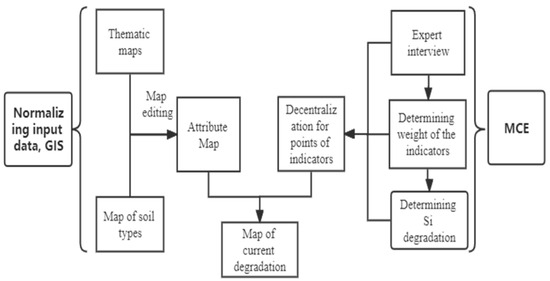 GIS supports building and managing data and establishing thematic maps. The hierarchical analysis model will support GIS, synthesize information, and assign the most appropriate weights to the factors [13,21]. After decentralization, weighting factors, using ArcGIS 10.3 software to overlay, combined with statistics, and integrate weights to obtain results on soil degradation (Figure 2).