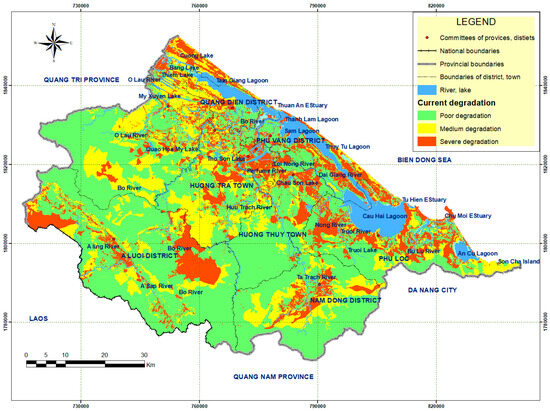 The study results shown on the map have confirmed that more than 40% of the land area in the Thua Thien Hue province is in moderate and severe degradation. The current factors causing soil degradation in the study area have been identified, in which humanity is the main factor. This is the result of unreasonable land use. The primary forms of soil degradation are caused by humans, such as soil being washed away and degraded by water. This results from intense and unreasonable land exploitation for a long time, incredibly inappropriate use and protection of forests due to low cover, and heavy seasonal rains, such that erosion is taking place firmly on fertile, sandstone, acid magma, shale, and inert erosive soils. In addition, soil pollution is also a significant cause of soil degradation. It is a consequence of using chemical fertilizers and pesticides, industrial, handicraft, aquaculture waste, and chemicals used in war and civil activities.