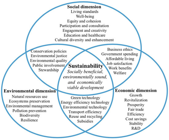 Sustainability is a thinking paradigm in the process of urban development [5]. When forming policies, sustainability is considered alongside the three bottom lines of economic development, social equity, and environmental protection [5]. The Organization for Economic Co-operation and Development (OECD) described some additional sets of sustainable development elements such as prosperity/profit, people, the planet, peace, and partnerships [24]. However, a lot of studies still utilize the common conceptual framework of social, environmental, and economic dimensions [25].