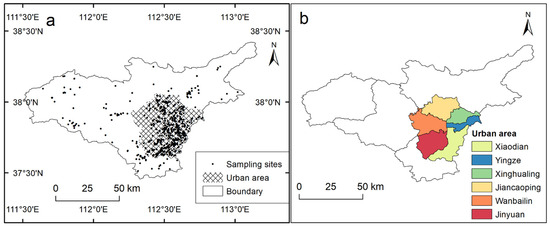 Sketch map of sampling sites in Taiyuan: (a) location of sampling sites; (b) administrative division of Taiyuan.