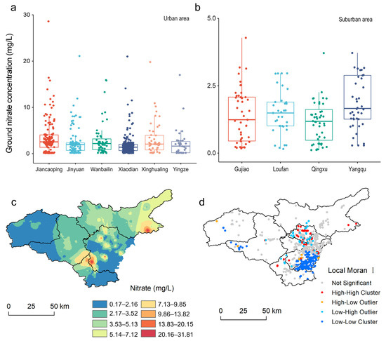 Nitrate concentration in each district of Taiyuan: (a) boxplots in urban areas; (b) boxplots in suburban areas; (c) spatial distribution map of nitrate concentration in Taiyuan; (d) clustering and outlier analysis of nitrate in groundwater in Taiyuan, using the Local Indicators of Spatial Association method (LISA).