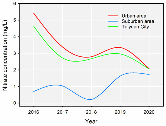 Taiyuan has taken a series of measures to optimize industrial structure, implement economic transformation and development, and actively develop new energy. This series of environmentally friendly measures from 2016 to 2020 led to a downward trend of NO3− concentration in the overall groundwater of Taiyuan over time. Annual variation is shown in Figure 3, and the groundwater nitrate pollution situation has been improved year by year.