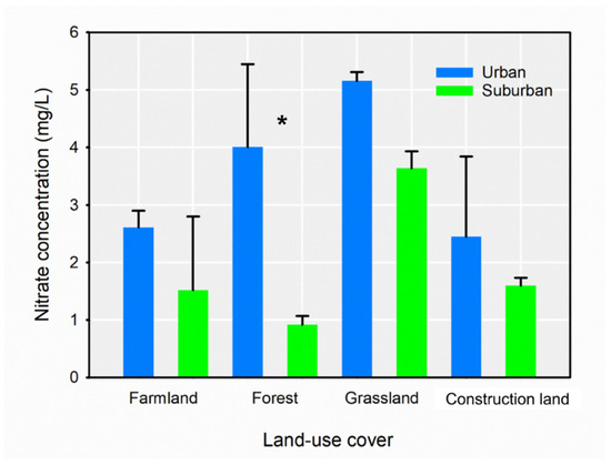 Variation of groundwater nitrate in different land-use covers in urban and suburban of Taiyuan City (* shows significant difference).