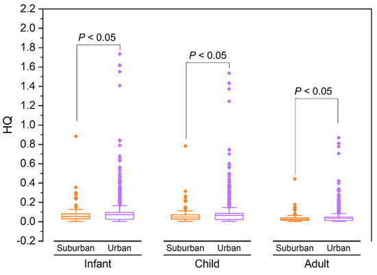 Significant differences in HQ between urban and suburban areas can be observed in Figure 5 (p < 0.05). HQ of infants, children, and adults in urban areas (the means were 0.1, 0.09, and 0.05, respectively) were significantly higher than in suburban areas (the means were 0.07, 0.06, and 0.03, respectively). In urban areas, the non-carcinogenic risks of infants, children, and adults were 1.43, 1.5, and 1.67 times higher than in suburban areas, respectively. All populations in suburban areas had HQ < 1, indicating that the risk of NO3− exposure among all populations in the suburban areas was at an acceptable degree.