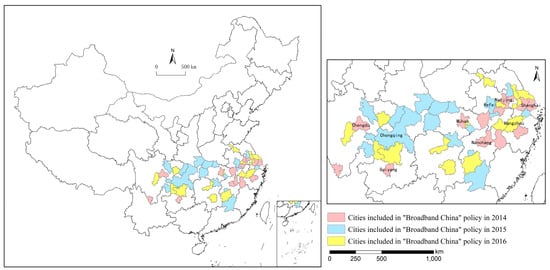 25]. The “Broadband China” strategy was first implemented in 2013, and then two other batches of pilot cities were announced from 2014 to 2016 (as in