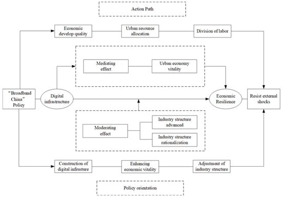 Therefore, how does digital infrastructure play a positive role in promoting urban economic resilience through urban economic vitality? On the one hand, digital infrastructure has positive impacts on the economic vitality of cities. The digital economy can achieve the revitalization of urban economic vitality by reducing information and communication costs, simplifying redundant links, and improving economic activity efficiency [