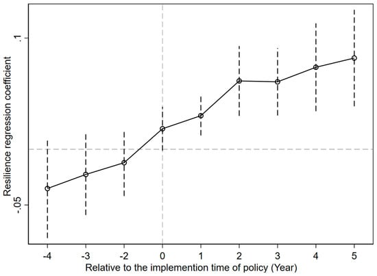 An important premise for adopting the DID method is that there is no major difference in the change rate of economic resilience between the treatment group and the control group before policy implementation. Therefore, the development trend of economic resilience for the two groups should remain parallel before the policy. To test the parallel trend hypothesis and avoid multicollinearity problems, we took the year 2014, when the policy started, as the base period and constructed the following model based on the practice of most scholars [