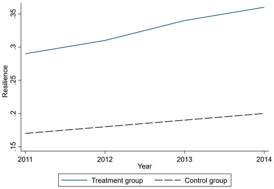 Here, Resilience is the dependent variable, measuring the degree of economic resilience. Digital is the independent variable, which indicates a binary dummy variable according to whether the city participates in the “Broadband China” policy at year t. Control represents different control variables, and λ is its coefficient. Constant terms, the city fixed effect, the year fixed effect, and error terms are represented by α0, ui, vt, and εit, respectively.