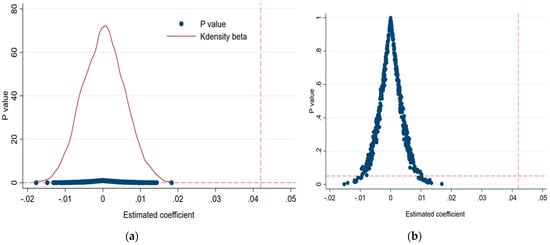 There were 61 cities in the control group, and we randomly selected 45 cities from 106 cities as the “pseudo treatment group”. As these 45 cities were pilot cities for the “Broadband China” policy and the other cities were the control group, we generated a “pseudo policy dummy variable” (interaction term) for regression. Interactions were randomly selected 500 times to check if the coefficients differed from the baseline estimation. In the 500 samples, 100% of the regression results were on the left side of the baseline regression coefficient. Subsequently, this study plotted the results of 500 sampling regressions. Considering that the difference between K density and P value will reduce the interpretation of the image, the K density line was removed and redrawn, as shown in